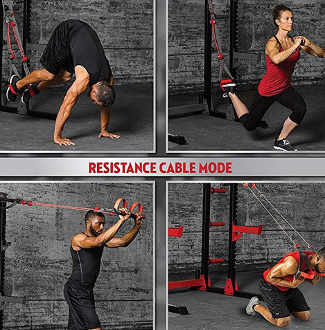 Included in the set are two adjustable suspension straps with non-slip handles, foot cradles, non-scuff door anchors, and adjustable length technology, all integrated into the patented 2-in-1 dual-mode system. The kit also features two Lifeline R3 30lb resistance cables, two R5 50lb resistance cables, an adjustable anchor strap with a rotating swivel, a carry bag, and a set of 30 exercise cards for beginner, intermediate, and advanced levels. Backed by a one-year warranty.